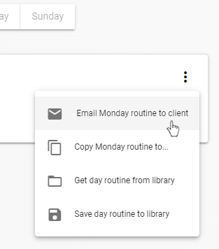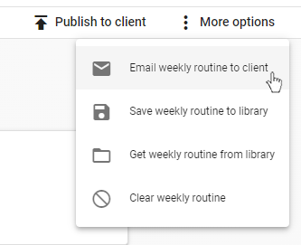 At this point if you have a workout program or day routine already saved in your library you can copy them into the client's currently empty program by choosing 'More options' at upper right (to get a copy of an entire workout program) or by clicking the 'more' icons on the right side of the current day workout routine (to get a copy of an individual day).
