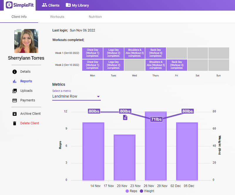 The client Reports page shows which workouts the client has checked off as complete, as well as displays progress metrics a client has entered for individual movements over time.