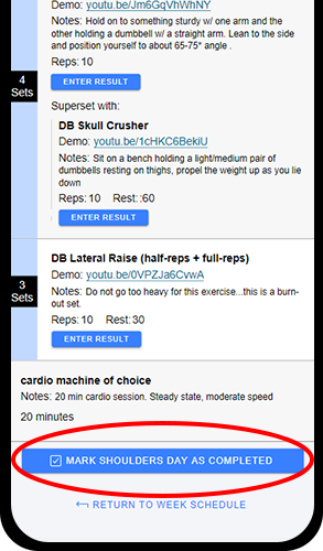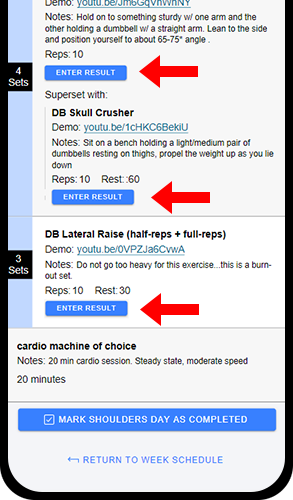 Client metrics: Clients have the option to enter notes and/or weight & repetition information for an exercise using the Enter Result button for individual strength exercises.