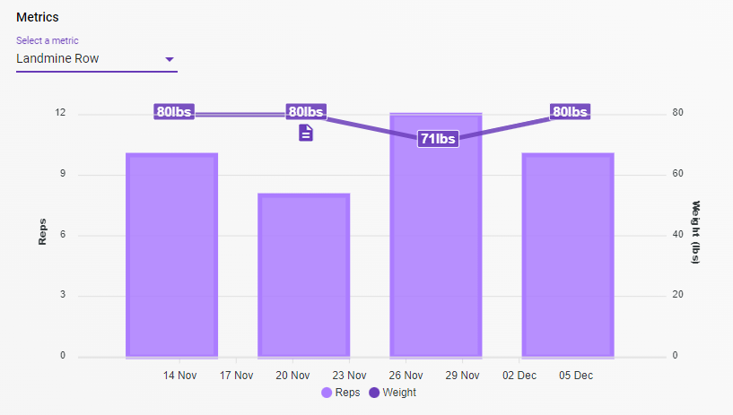Once you have selected a metric the resulting chart will display repetitions as vertical bars and the weights used in white labels.