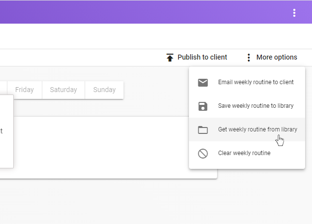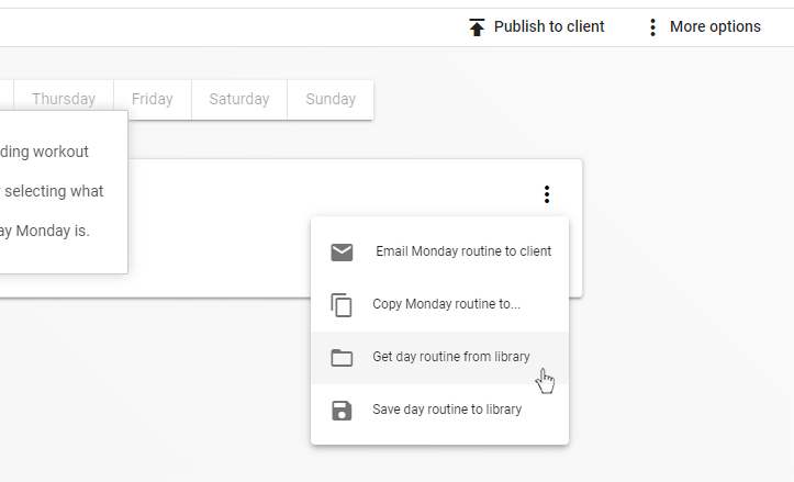 At this point if you have a workout program or day routine already saved in your library you can copy them into the client's currently empty program by choosing 'More options' at upper right (to get a copy of an entire workout program) or by clicking the 'more' icons on the right side of the current day workout routine (to get a copy of an individual day).