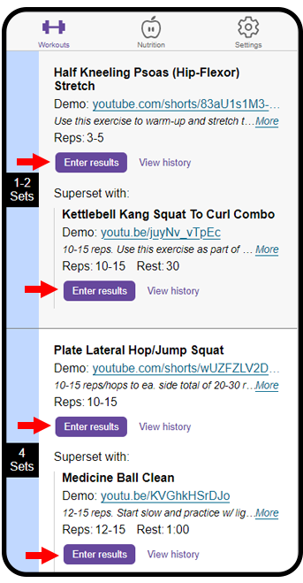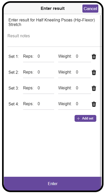 To enter this information, click on the 'Enter results' button next to the exercise you have completed. In the popup that shows enter the result for your exercise.
