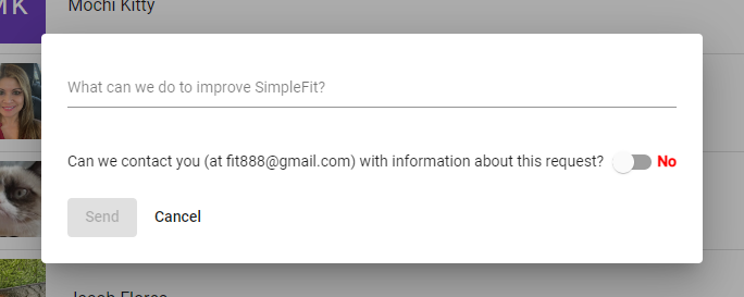 Your suggestion will be forwarded to the SimpleFit team. It may help us to reach out to you directly with questions when deciding if and how to implement your suggestion. However, you can choose to opt-out of this.